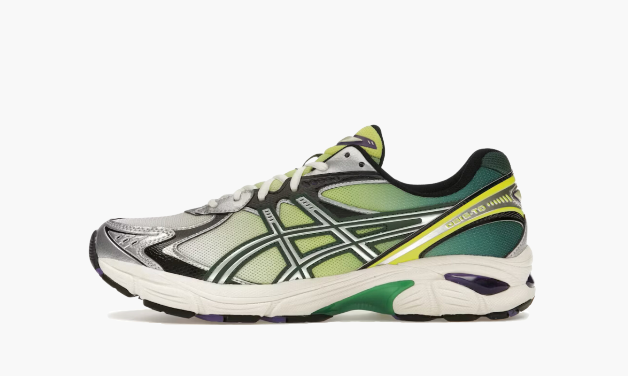 Skoen kombinerer retro-løbesilhuetten fra ASICS med et dristigt farveskema, der afspejler Green Goblins karakteristiske grønne og lilla nuancer. Overdelen består af åndbart mesh og premium læder, der sikrer både komfort og holdbarhed.