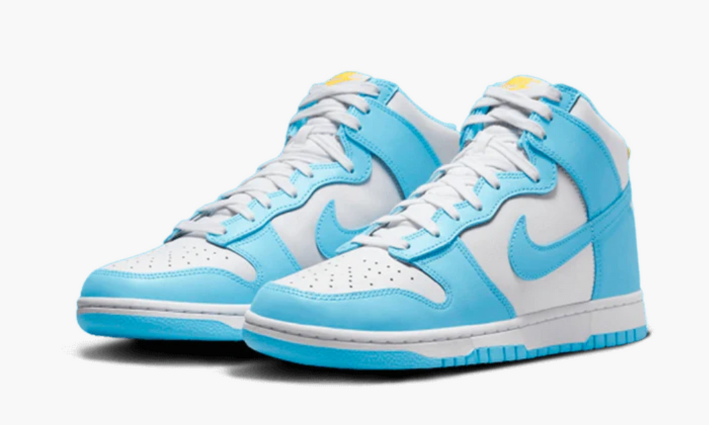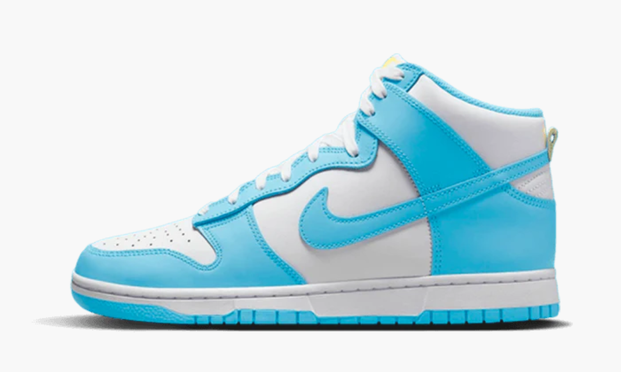 En Nike Dunk High som helt sikkert kun kan blive et hit. Den lyseblå farve er forevigt et kæmpe hit, den klæder denne sko super godt. Hvid, lyseblå og en snert af gul giver de perfekte sommer vibes.