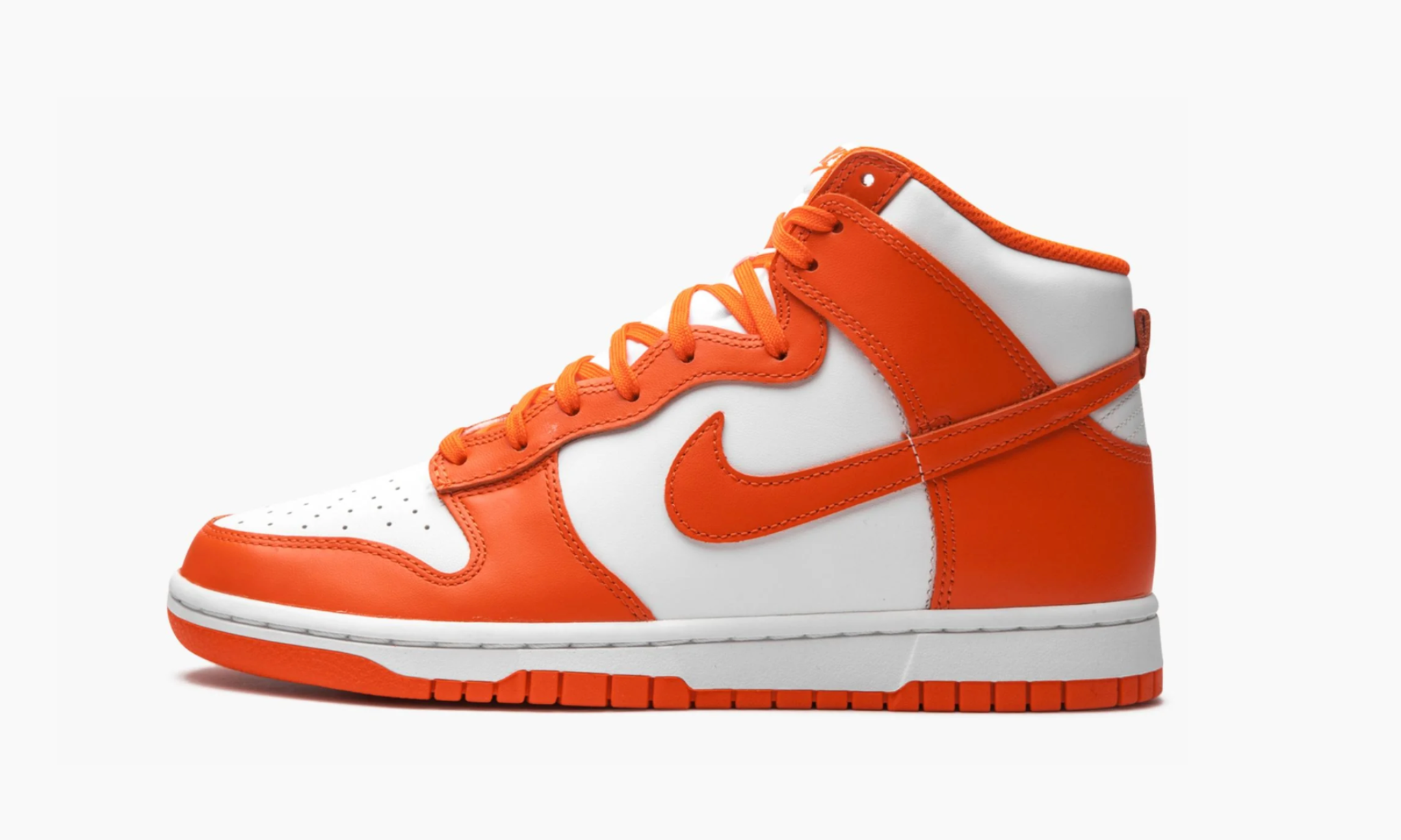 Den nye Nike Dunk High Syracuse er utrolig eftertragtet, og det forstår vi godt! Siden low versionen udkom har den orange farve hængt på de flestes tøjstativer. En frisk Dunk High konstrueret i hvidt og orange læder. Et must-have til den varme tid!