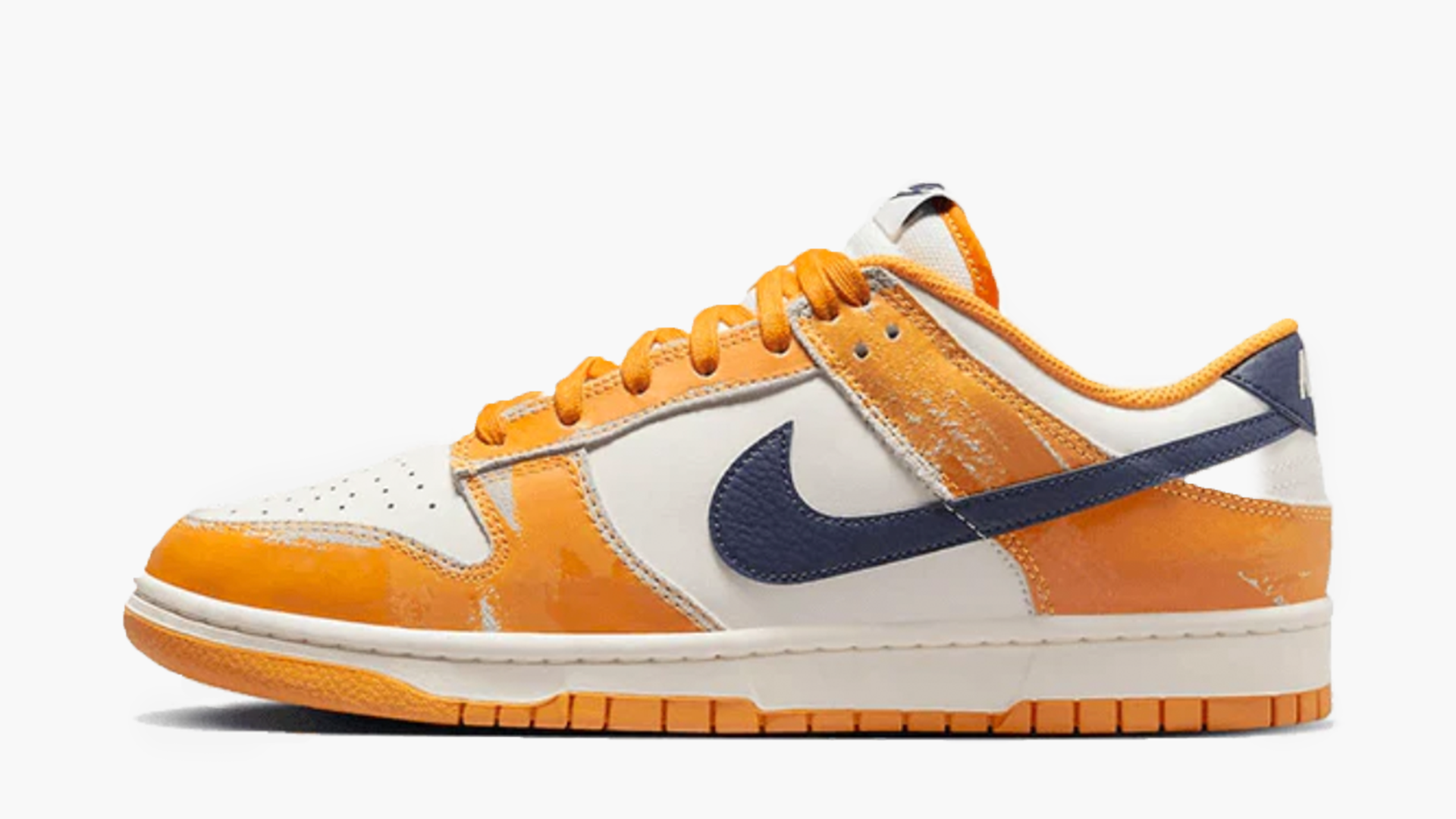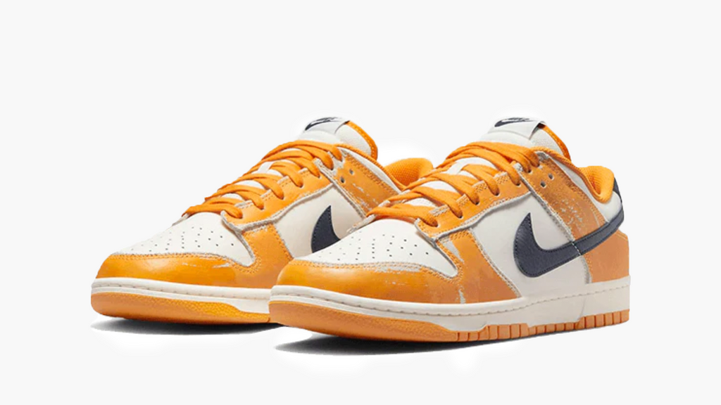 Denne Nike Dunk Low Wear and Tear præsenterer en base i hvidt læder, ledsaget af paneler i orange læder og en Swoosh i mørkeblåt læder på hælstykket. Den henter sit personlige look fra det slidte udseende.