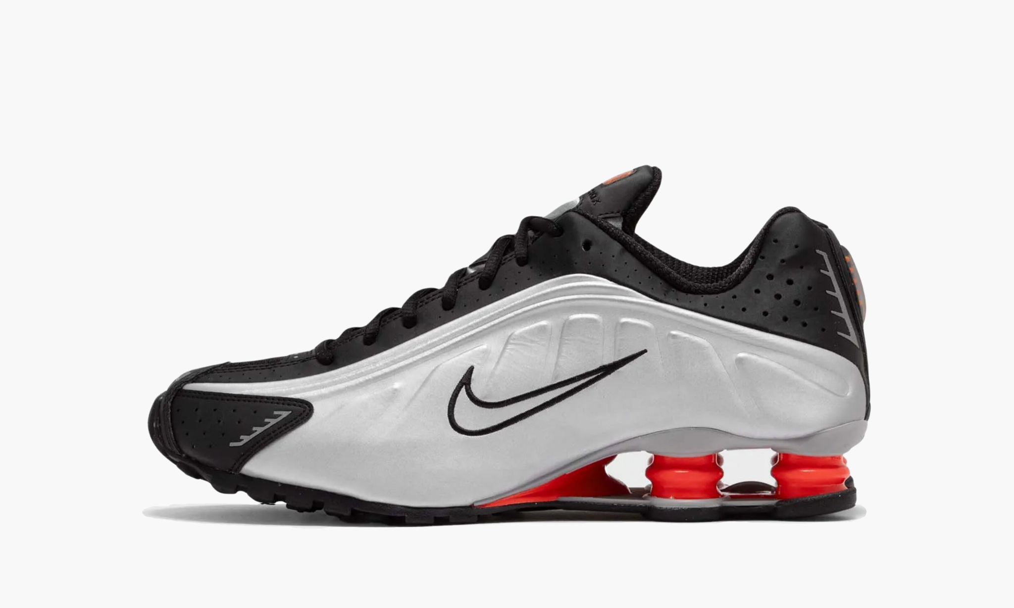 Nike Shox R4 Black Metallic Silver er en moderne og stilfuld sneaker, der kombinerer klassisk sort med skinnende sølvdetaljer for et futuristisk look.